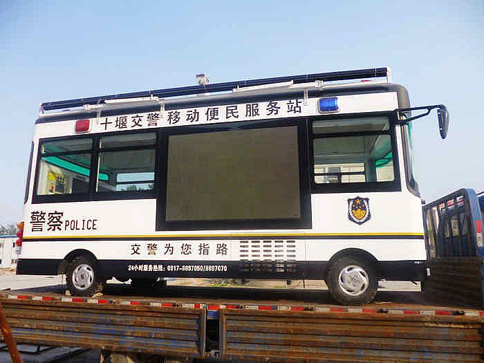 湖北十堰交警從我公司定做一輛移動(dòng)便民警務(wù)室,此警務(wù)室與其他警務(wù)室相比,最大特點(diǎn)是 車身有一塊巨大的LED顯示屏,可以清晰的顯示當(dāng)?shù)貙?shí)時(shí)的交通狀況,交警提示等信息,大大方便了廣大車主出行。 移動(dòng)便民警務(wù)室發(fā)車儀式