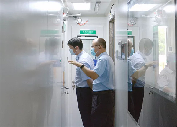 徐翀理事長一行走進躍迪集團生產車間,現場查看企業生產、作業情況,并進入躍迪集團新產品核酸檢測方艙認真聽取了解了方艙使用功能、作業流程、安全性能等方面的介紹。徐翀理事長一行積極肯定了躍迪醫療系列車的優勢和實用性,并對公司在疫情防控和醫療救護方面做出的貢獻表示高度贊揚。