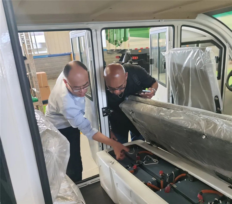 躍迪集團副總裁崔清學向美國客商Tony Joseph介紹了躍迪集團自主研發的躍迪純電動洗掃車。