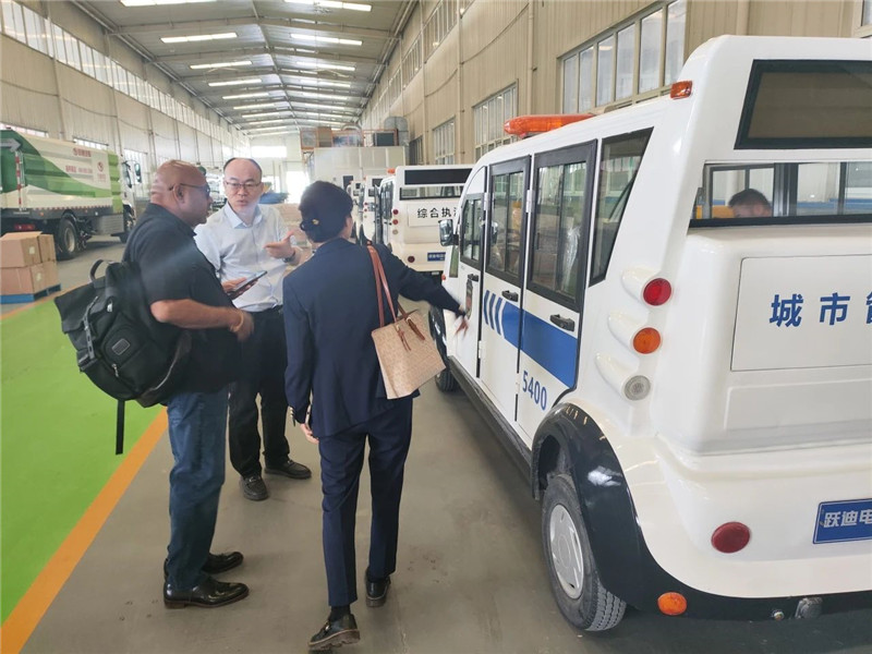 躍迪集團副總裁崔清學向美國客商Tony Joseph介紹了躍迪集團自主研發的躍迪純電動巡邏車。